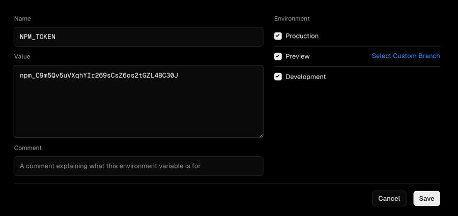 Please make sure you have added the following NPM_TOKEN in your environment variables on vercel